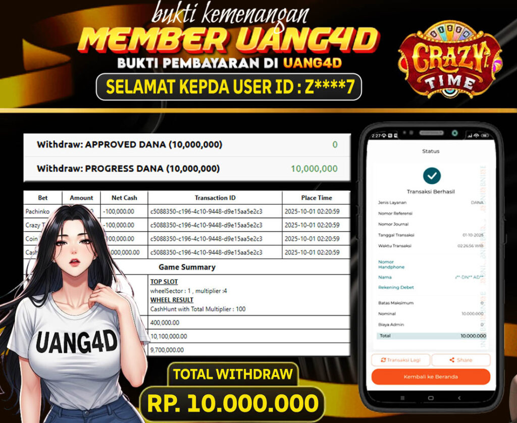 UANG4D dikenal sebagai situs terpercaya yang selalu menghadirkan pengalaman bermain slot online yang aman, fair, dan berlisensi resmi. Di sini, kami tidak hanya sekadar memberikan janji, tapi bukti nyata berupa slip kemenangan yang dapat Anda lihat secara langsung.
