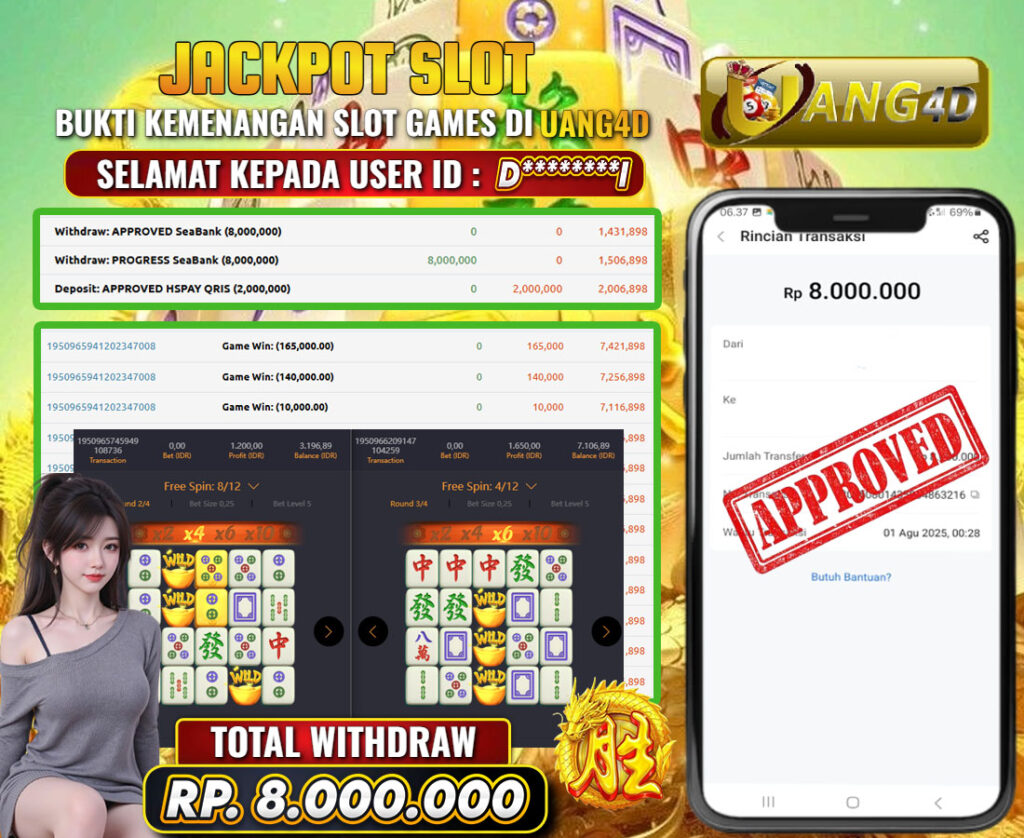 Jangan lewatkan kesempatan untuk meraih kemenangan besar. Daftar sekarang di UANG4D dan rasakan pengalaman bermain slot terbaik yang pernah ada! Putar gulungan, menangkan jackpot, dan jadilah bagian dari komunitas pemain sukses kami!